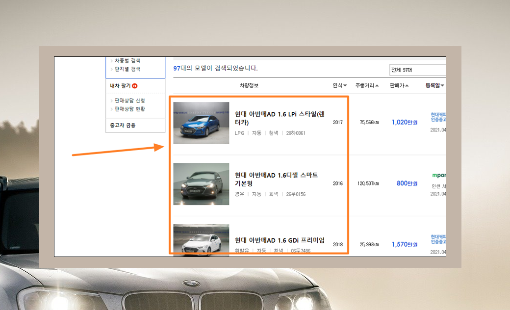 1. 제가 금일 기준으로 현대의 아반떼AD를 찾아보았어요. 97대가 검색이 되었는데요. 이 정도면 연식, 주행거리, 세부등급, 판매가를 참고하여 대략적인 시세를 파악할 수 있어요. "정확히 얼마" 이렇게 떨어지는 것은 아니고요. 많은 매물을 살펴보면서 본인이 시세를 자연스럽게 이해해야 해요.