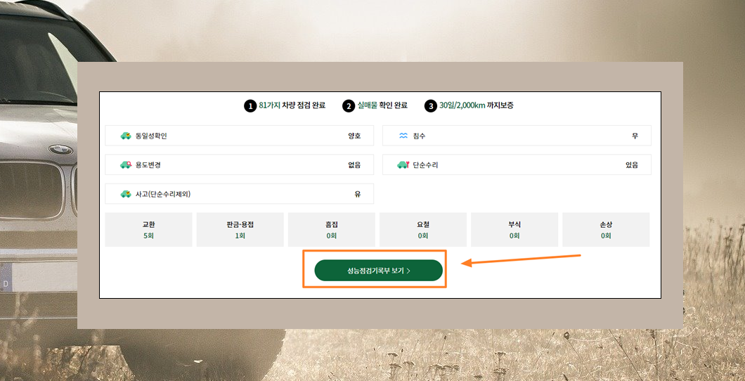 11. 시세보다 아무리 싸게 구입해도 중고로 자동차를 구매하면 성능에 관한 불안감이 있을 수 있는데요. 그러한 부분을 명확히 하고자 성능점검기록부 자료를 제공하고 있어요. 이를 통해 차량에 어떤 부분이 문제가 있는지 꼼꼼히 확인해 보세요.