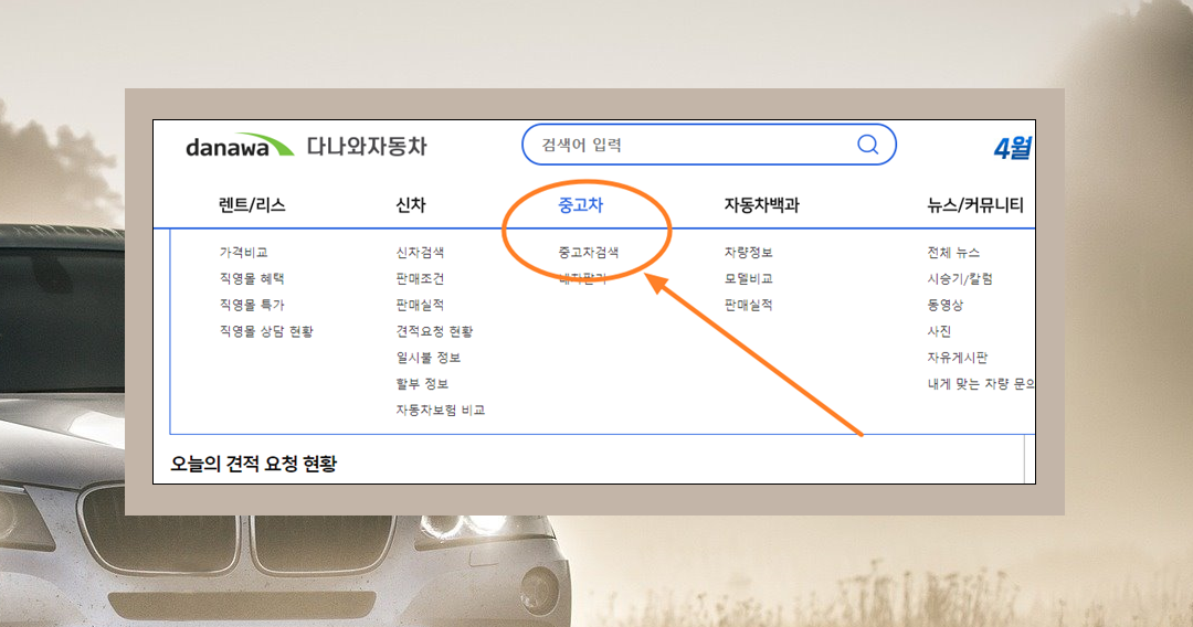3. 다나와 자동차 사이트에 접속하면 메뉴에 있는 중고차를 클릭해 주세요. 그럼 검색 페이지로 이동하는 하위 메뉴를 찾을 수 있어요.