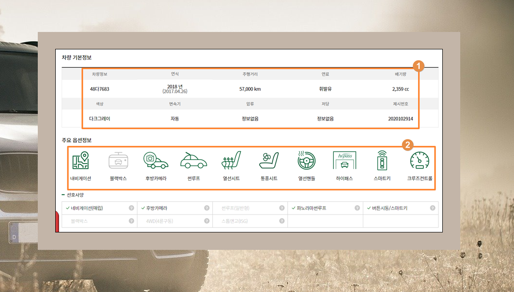 10. 차량에 대한 기본정보와 옵션정보도 제공하고 있는데요. 옵션의 경우 개인 취향이기 때문에 자신에게 맞는 것을 선택하면 돼요. 중고자동차 특성상 옵션을 추가하거나 빼지 못하기 때문에 옵션 확인을 잘하셔야 해요.