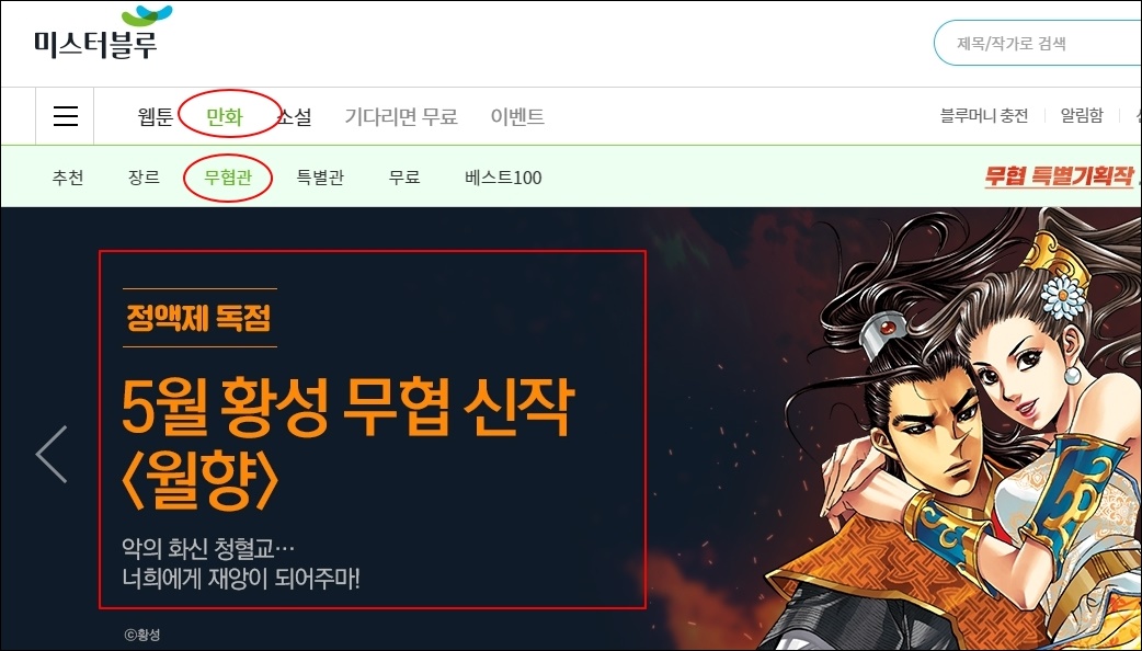 만화 작품 중에서도 여러 가지 종류가 있는데요. 추천 작품, 장르별, 무협관, 특별관, 무료 작품, 베스트 100이 있습니다. 여기에서 무협관을 클릭해 보세요. 최근 황성 무협 신작인 월향이 나왔네요.