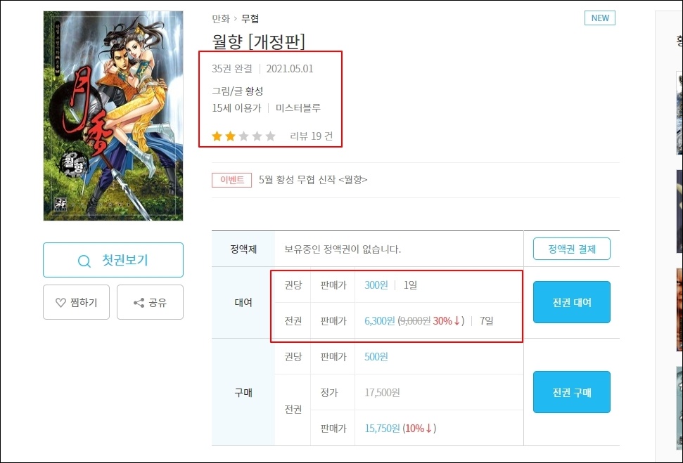 식작인 월향 개정판을 선택해 보았습니다. 완결 작품이고, 전체를 보기 위해서는 구매를 해야 하는데요. 구매하는 것보다 대여 서비스를 이용하면 저렴한 가격이 전체 모두 감상할 수 있습니다.