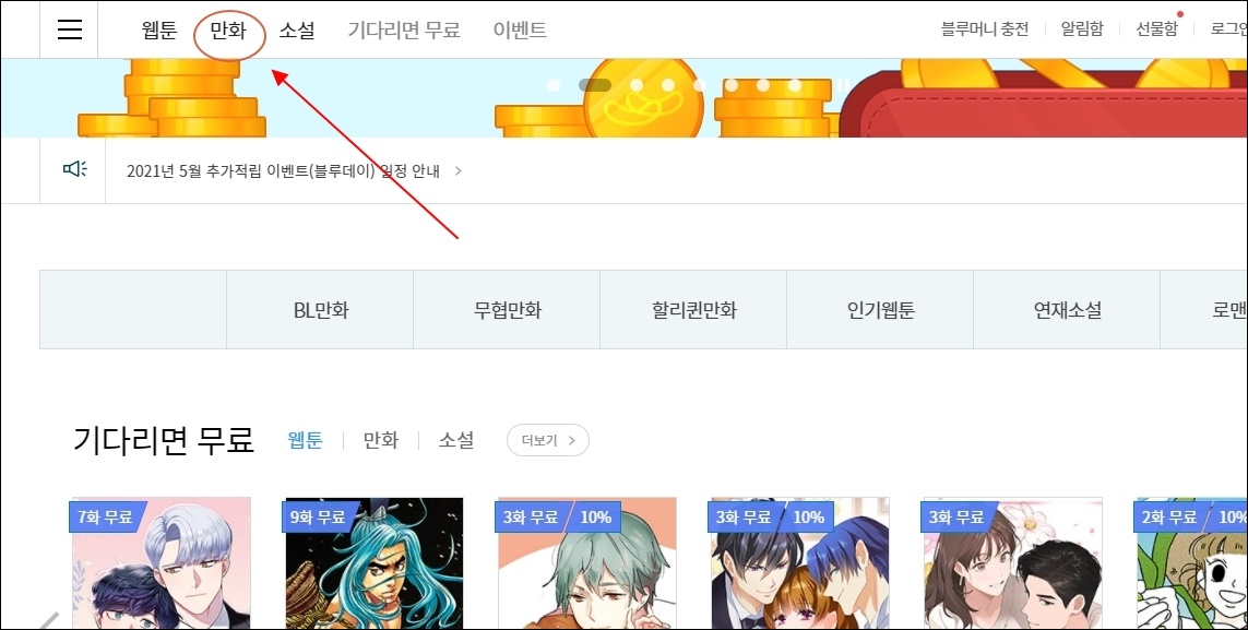 미스터블루 홈페이지에 접속했습니다. 메인화면을 보면 여러 가지 작품에 대하여 무료 서비스를 진행하고 있음을 알 수 있습니다. 웹툰, 소설도 이곳에서 볼 수 있죠. 메뉴에서 "만화"을 클릭해 주세요.