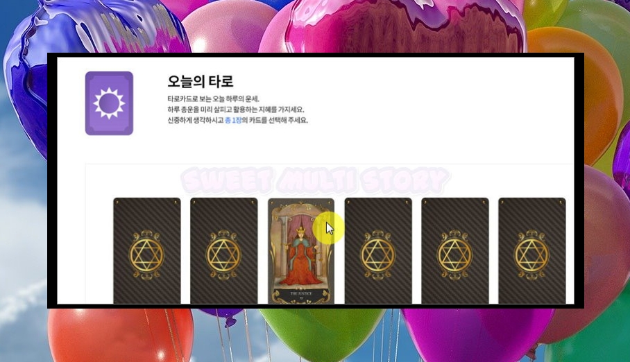 6. 오늘의 타로 운세 서비스도 이용해 보세요. 해당 서비스의 경우 사주 정보가 아닌 본인이 어떤 카드를 선택하느냐에 따라 결과가 달라져요. 나름 카드를 뽑는 재미가 있어요. 뒤집혀져 있는 여러 카드 중에서 하나를 선택해 보세요.