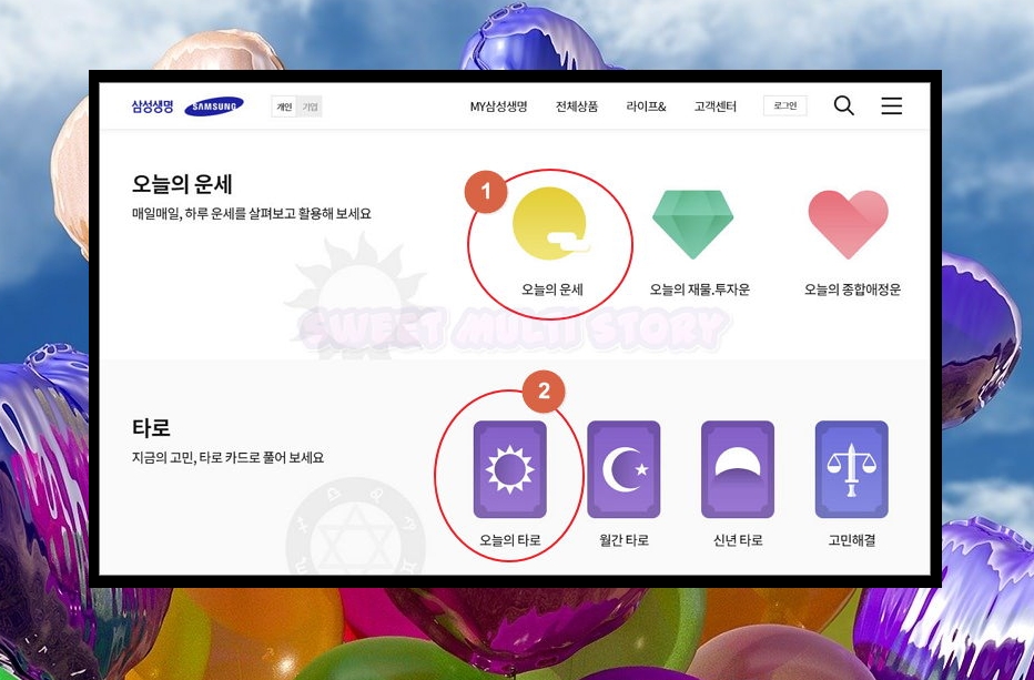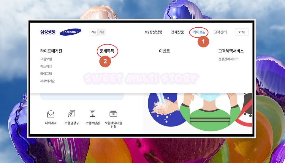 1. 요즘 운세를 볼 수 있는 사이트는 꽤 많아졌어요. 대부분 무료로 볼 수 있기 때문에 부담이 전혀 없는데요. 그 중에서 퀄리티 높은 곳을 뽑아보았어요. 바로 삼성생명 공식 홈페이지에서 제공하는 운세톡톡 서비스인데요. 메인화면에서 [라이프&]을 클릭하면 찾을 수 있어요.