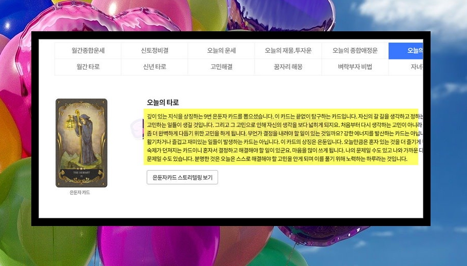 8. 카드에 대한 설명과 함께 어떤 운이 찾아오는지 상세하게 알려주는 풀이가 나타났어요. 꼭 좋은 결과만 나오는 것은 아니에요. 그렇다고 해서 나쁜 결과가 나왔다고, 오늘 하루를 망치는 것은 아니에요. 재미로 보고, 오늘 계획을 세울 때 참고할 정도로만 이용하는 것이 나아요.