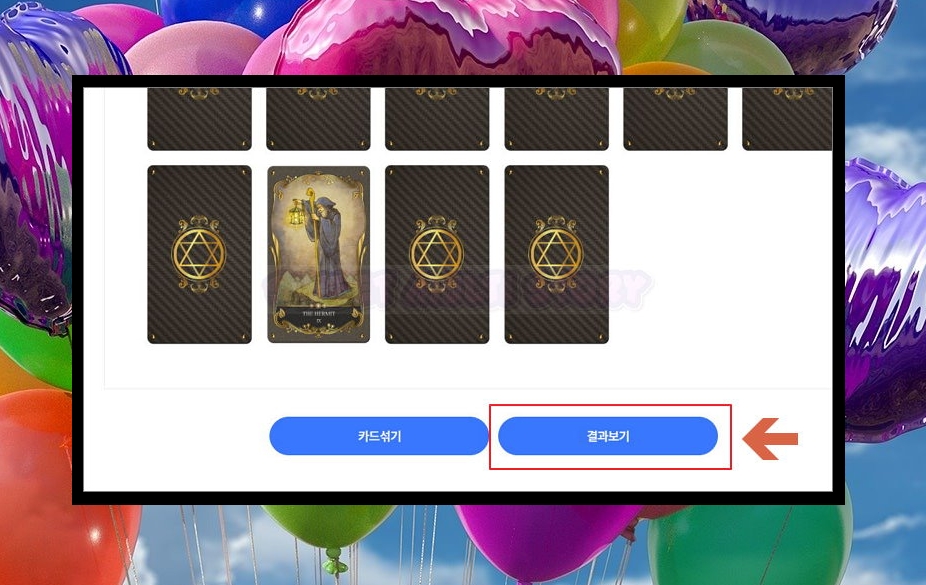 7. 타로 카드를 선택했다면 [결과 보기] 버튼을 클릭해 주세요. 그럼 오늘 운세 보기를 하실 수 있어요.