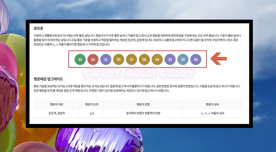 5. 주기적으로 로또 복권을 구입하는 취미를 가지신 분이라면 로또운을 확인해 보세요. 오늘 복권을 구매하면 좋은 날인지 알려주고, 추천 번호도 확인이 가능해요. 그 밖에도 행운을 가져다 주는 4가지 요소를 살펴볼 수 있는데요. 이러한 것을 최대한 활용하면 오늘 운세가 더욱 좋아질 것 같아요.