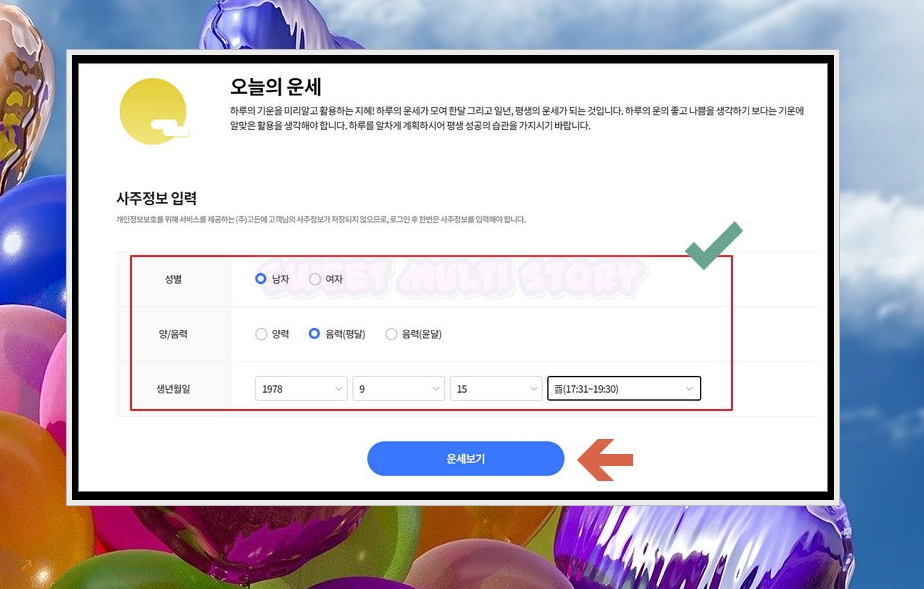 3. 오늘의 운세 서비스를 클릭해 보았어요. 이를 통해 하루의 기운을 미리 알 수 있는데요. 이용 방법은 간단해요. 성별, 생년월일, 태어난 시각을 정확하게 입력한 후 [운세 보기] 버튼을 클릭하면 돼요. 하루 계획을 세울 때 활용하면 참 좋을 것 같아요.