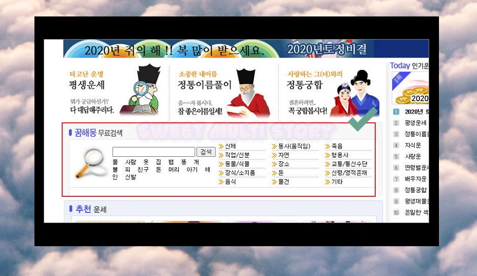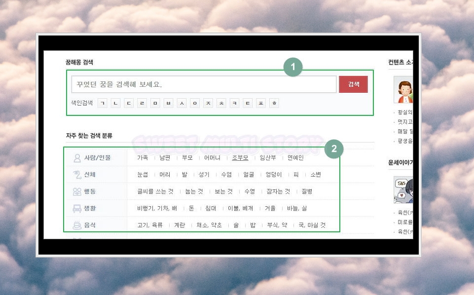 c. 새롭게 열린 페이지에서는 해몽에 관련된 많은 내용을 볼 수 있는데요. 기존 다음 무료 꿈 풀이 보기 서비스를 대신하기에 안성맞춤이에요. 검색을 하거나 카테고리 선택을 통해 어젯밤에 꾼 것이나 내용을 찾아보세요.
