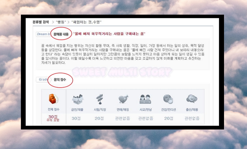 f. 게시물을 클릭하면 무료 보기 가능한 풀이 내용을 확인할 수 있는데요. 다른 곳에 비해 풍부한 내용으로 일반인도 이해하기에 적합해요. 꿈의 점수도 있기 때문에 이것이 금전, 시험, 연애, 사고, 건강, 출산 등에 어떤 영향을 얼마나 미치는지 쉽게 알 수 있어요.