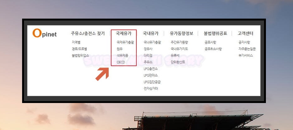 메뉴를 보시면 국제유가에 대한 여러 서비스 및 정보를 제공하고 있는데요. 국제유가 총괄, 원유, 석유제품, OECD 이렇게 4가지를 선택할 수 있게 되어 있어요.