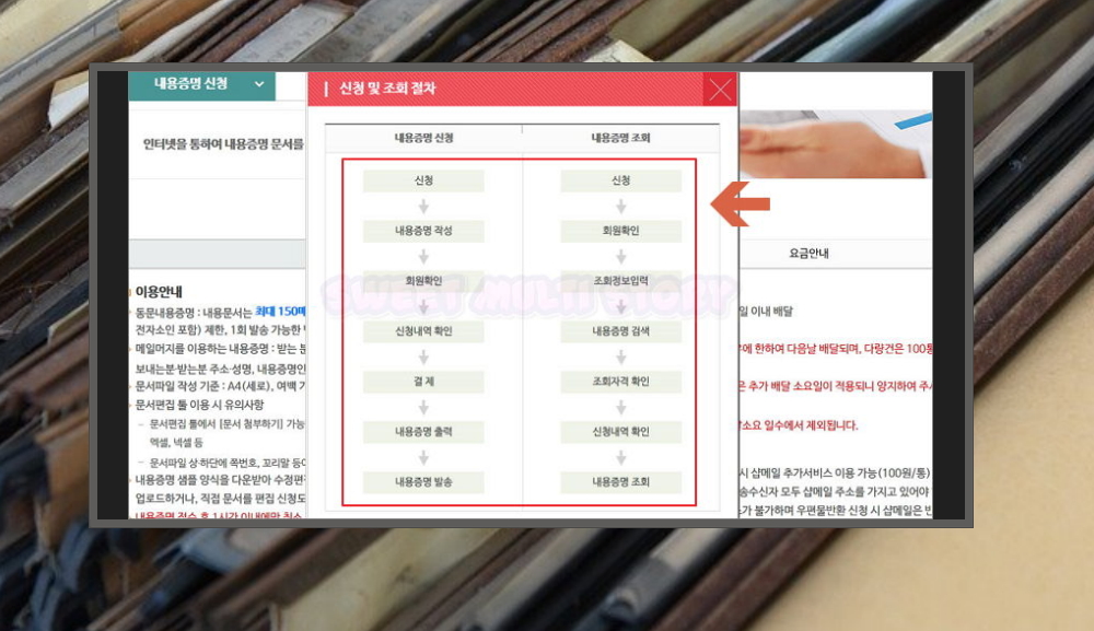 8. 우체국 홈페이지를 통해 내용증명을 신청하거나 조회하는 절차를 한 번 살펴볼게요. 절차가 간단함을 알 수 있어요. 다운 받은 서식을 작성하고, 본인과 신청내역에 대한 확인을 한 후 결제하고, 문서를 출력해서 발송하면 돼요. 사이트에서는 쉽게 진행할 수 있도록 안내 문구가 잘 표시되어 있어요. 안내에 따라 진행하면 문제 없어요.