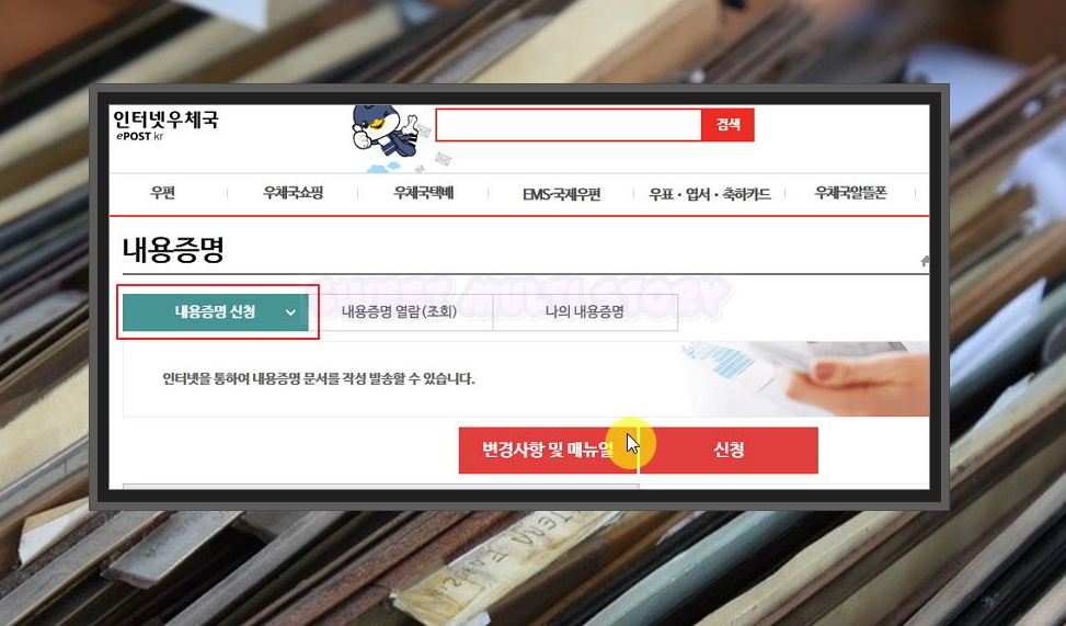 3. 새롭게 열린 웹페이지에서는 내용증명 발송을 신청하거나 기존에 보낸 내용을 열람하거나 조회할 수 있어요.