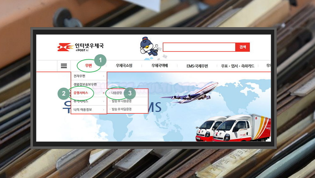 2. 우편이나 택배를 보내거나 쇼핑을 할 수 있는 인터넷 우체국 사이트에 접속했어요. 메뉴에서 [우편]과 [증명서비스]를 클릭해 보세요. 그럼 내용증명에 관련된 서비스 메뉴를 찾을 수 있어요.