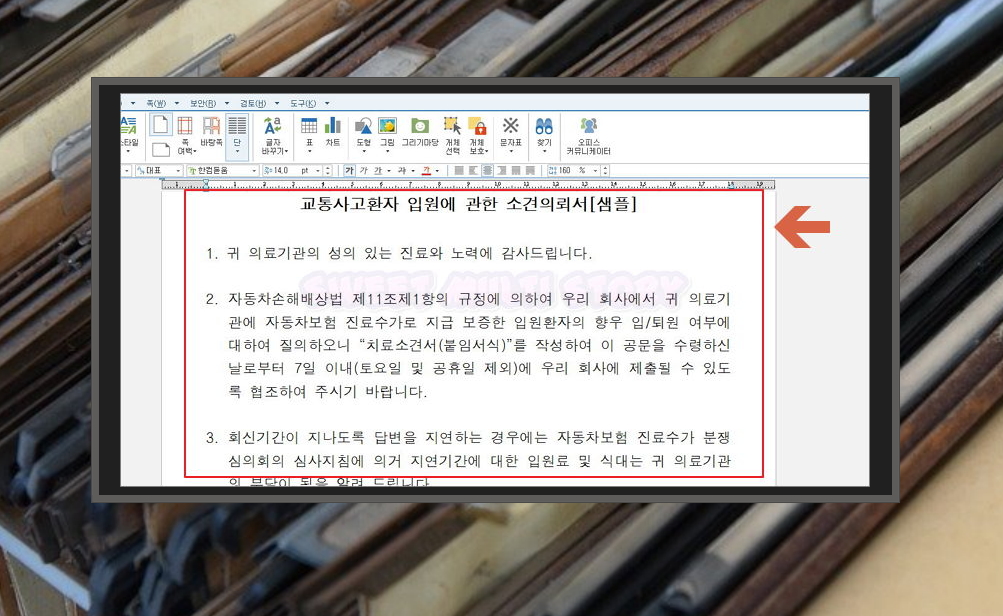 7. 교통사고 환자 입원에 관한 소견의뢰서를 보내는 경우도 있는데요. 이에 맞는 무료 서식을 열어 보았어요. 첨부해야 할 서류로 어떤 것이 필요한지 알 수 있네요. 물론 내용에 따라 첨부 서류는 변경될 수 있어요.