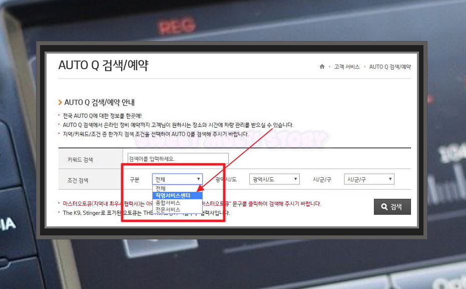4. AUTO Q 검색 페이지에서 직영점을 찾으신다면 조건 검색의 구분에서 전체를 직영서비스센터로 변경해 주세요. 전체를 하면 종합 및 전문 서비스센터도 포함이 돼요. 그 다음 광역시/도와 시/군/구 항목을 통해 집에서 가까운 지역을 지정한 후 검색 버튼을 눌러주세요.