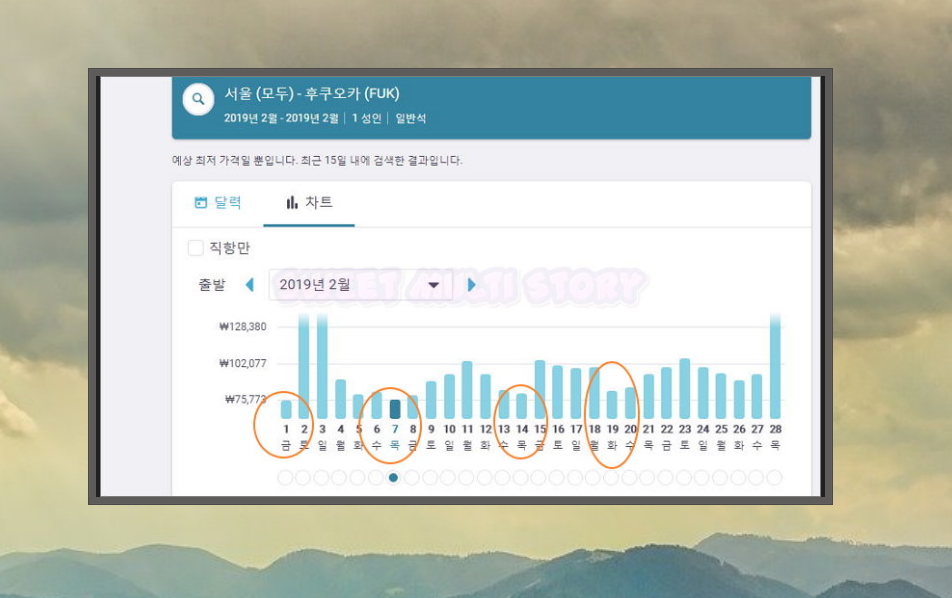 3. [항공권 검색] 버튼을 누르면 날짜별로 최저가 비행기표의 가격을 확인할 수 있어요. 차트에 나온 막대 그래프에서 가장 짧은 것을 골라보세요. 보통 평일에 출발하는 항공권이 저렴해요.