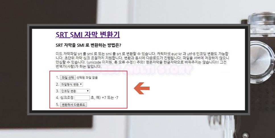 1. 일단 가지고 있는 자막을 변환하는 것이 좋아요. 보통 해외에서는 SRT를 많이 사용해요. 국내에서는 SMI를 많이 사용하고요. 제가 사용하는 프로그램을 SRT 위주인데요. SMI 파일을 가지고 있다면 SMISRT 사이트를 통해 변환을 해주세요.