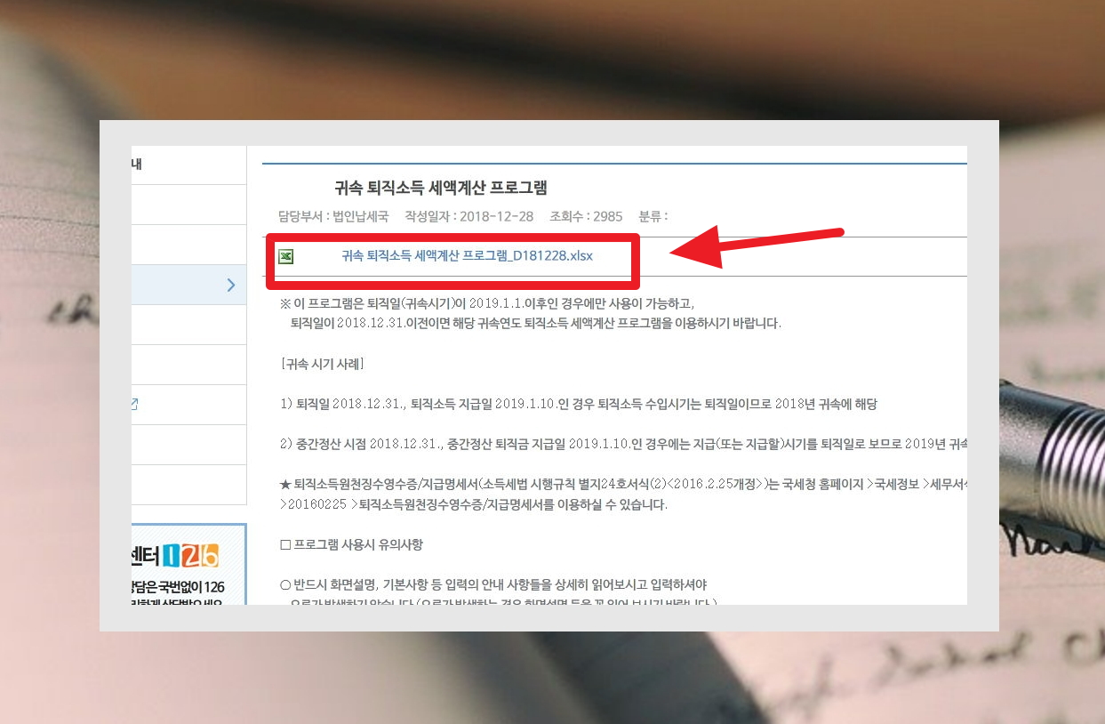 7. 게시물에 들어가보면 엑셀 파일이 첨부되어 있는데요. 엑셀로 된 계산기에요. 엑셀 파일을 열고 퇴직에 대한 정보를 입력하면 세액을 산출하실 수 있어요.