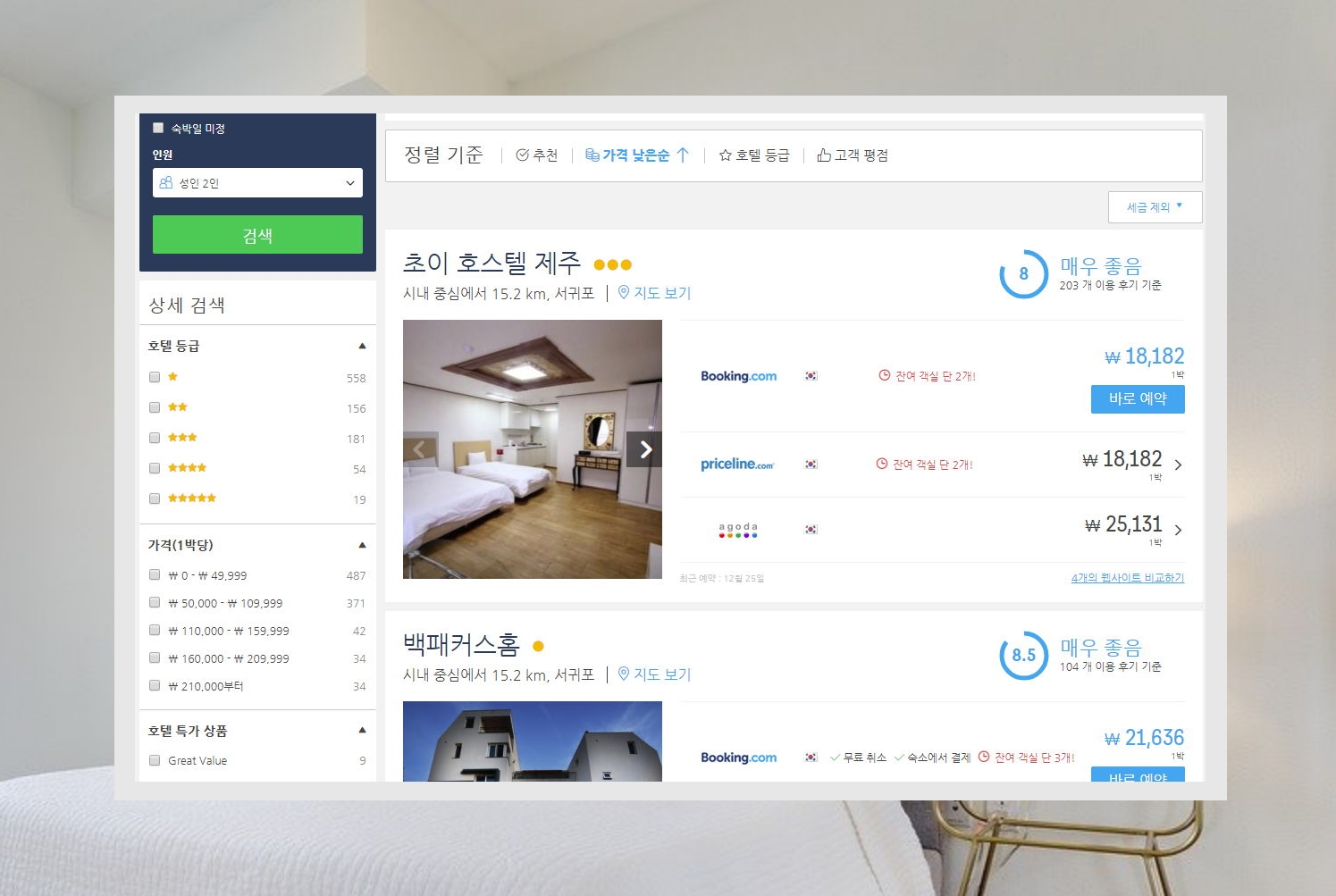 4. 국내 유명 여행지인 제주도에 있는 숙소를 검색해 보았습니다. 가격 낮은 순으로 정렬을 하니 2만원도 안되는 객실을 예약할 수 있네요. 왼쪽에 보면 상세 검색이 있습니다. 호텔, 모텔, 게스트하우스 등 호텔의 유형을 지정하거나 등급과 가격을 설정할 수 있어요.