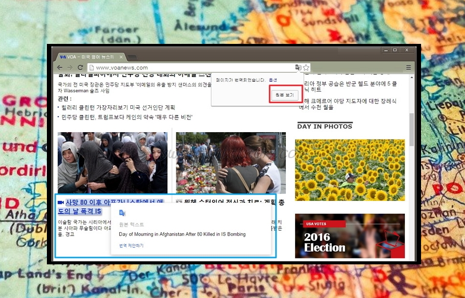 영어로 된 사이트에 접속했는데요. (영어공부하기 좋은 곳인 VOA 입니다.) 화면에 마우스 우클릭을 하면 위와 같이 메뉴가 나온답니다. '한국어로 번역'을 누르면 어떻게 될까요?