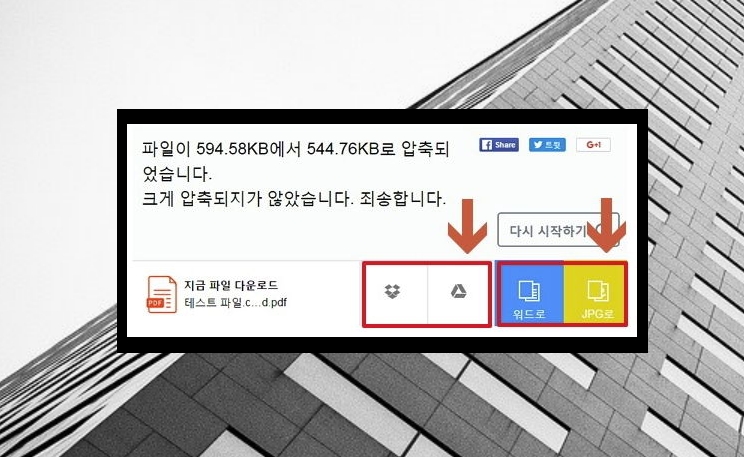 5. 테스트를 해보았습니다. 원래 용량이 작아서 그런지 10% 정도 밖에 압축되지 않았네요. 이정도가 많은 크게 압축된건지 아닌건지 잘 모르겠지만, 죄송하다는 사려깊은 말에 기분은 나쁘지 않았습니다. 해당 파일은 바로 다운로드 하실 수 있고 인터넷 저장매체로 보낼 수도 있답니다. 혹시 압축이 맘에 안들거나 다른 형식으로 변환하고 싶으실때는 "워드로", "JPG로"를 이용해 보세요. JPG는 워낙 용량이 작은 이미지 파일 형식이기 때문에 만족하실 수 있을 겁니다.