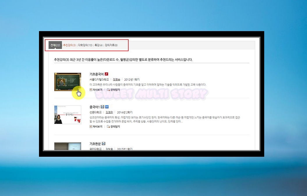 중국어 기초와 관련이 있는 강의만 22개가 되는데요. 강좌 하나당 한 학기 동안 배우는 수업이기 때문에 중국어를 제대로 배우기 좋습니다.