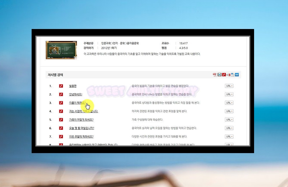 하나의 강좌 안에는 차시별 강의가 있습니다. 보통 12개에서 24개의 강의로 구성되어 있는데요. 기초중국어 강의에서는 발음, 기본 회화를 중심으로 배우기 가능합니다. 순서대로 수업을 들을 수도 있고, 원하는 차시의 수업을 듣기도 가능해요.