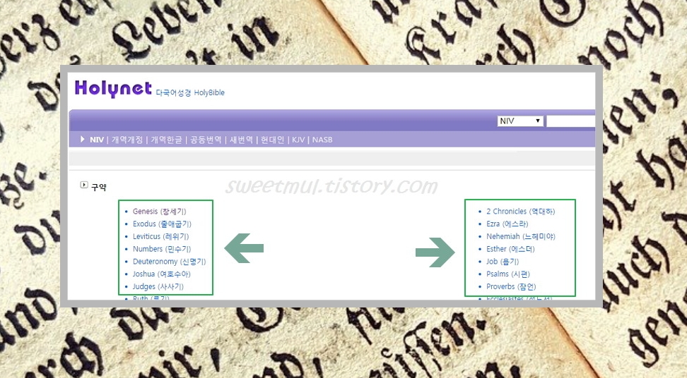 홀리넷 사이트에 접속하시면 창세기에서부터 요한계시록까지 구약과 신약 모두 읽을 수 있는데요. NIV 외에도 개역개정, 개역한글, 공동번역, 새 번역, 현대인 등 다양한 버전도 제공한답니다. 국제뉴스에서 보니 다양한 버전으로 읽는 것이 좋다고 하던데요. 나중에 실천해보고 싶네요.