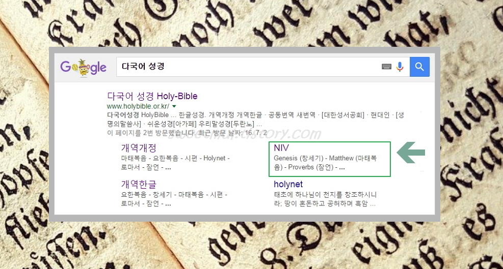 구글에서 검색하시면 바로 NIV 페이지로 접속하실 수 있는데요. 해당 사이트에서는 앞서 말씀드린 NIV, KJV, NASB 모두 보기 가능하답니다. 그럼 이용법과 더불어 한영보기 방법을 알려드릴게요.