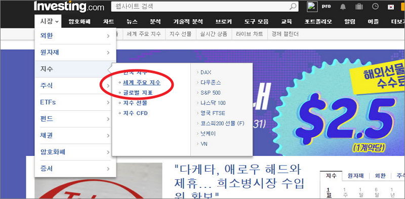 ▲ 메뉴에서 "세계 주요 지수" 선택