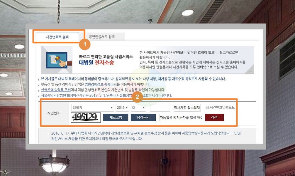 법적인 문제에 휘말렸을 때 많은 분들이 전문가에게 의지하는 경향이 있습니다. 하지만 실제로는 진행되는 상황을 스스로 파악하는 것이 중요합니다. 온라인 사이트에서는 쉽게 나의 사건을 검색할 수 있는 기능을 제공하고 있기 때문에 생각보다 어렵지 않습니다. 해당 번호를 모르시는 경우에도 번호조회 기능을 통해 알아볼수 있고요.