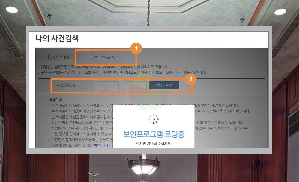 제가 알려드린 방법으로 접속하게 되면 공인인증서로 우리가 찾고자 하는 것을 검색을 할 수 있는 대법원 사이트의 웹페이지가 열리는데요. 공인인증서를 이용하여 해당 정보를 확인하는 경우에는 보안프로그램을 설치해야 해요. 보통 자동으로 되지만, 암호화 프로그램에 문제가 있다면 아래에 있는 안내를 참고하여 프로그램을 수동으로 설치하셔도 돼요. 보안 프로그램 설치가 완료되면 주민등록번호를 입력한 후 [인증서 확인] 버튼을 눌러주세요.
