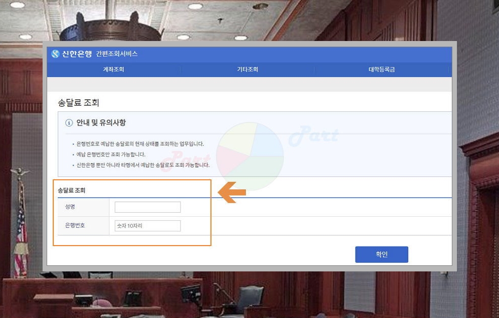 앞서 언급한 송달료 조회를 통해 관련 번호를 찾는 방법을 알려드릴게요. 대법원 사이트에서 신한은행 간편조회서비스 링크를 누르면 해당 웹페이지로 접속하게 되는데요. 송달료에 관한 성명과 은행번호만 입력하고, 확인 버튼을 누르면 사건번호를 알아 낼 수 있어요.