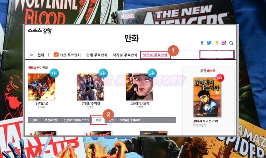 ▲ '장르별 무료만화 ▷ 무협' 클릭