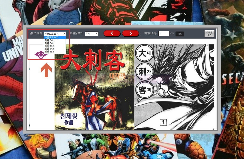 원하는 작품을 클릭하면 사이트에서 바로 작품보기 가능한데요. 좌측 상단에 '넘기기 효과'를 이용하시면 전권 정주행할 때 편리합니다. 마지막 페이지까지 손가락 까딱하지 않고 넘길 수 있죠.