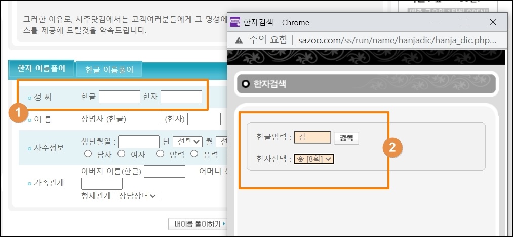 몇 가지 정보를 입력해야 결과값을 얻을 수 있는데요. 가장 먼저 성씨 부분이에요. 성씨의 경우에도 한자로 입력을 해야 해요.