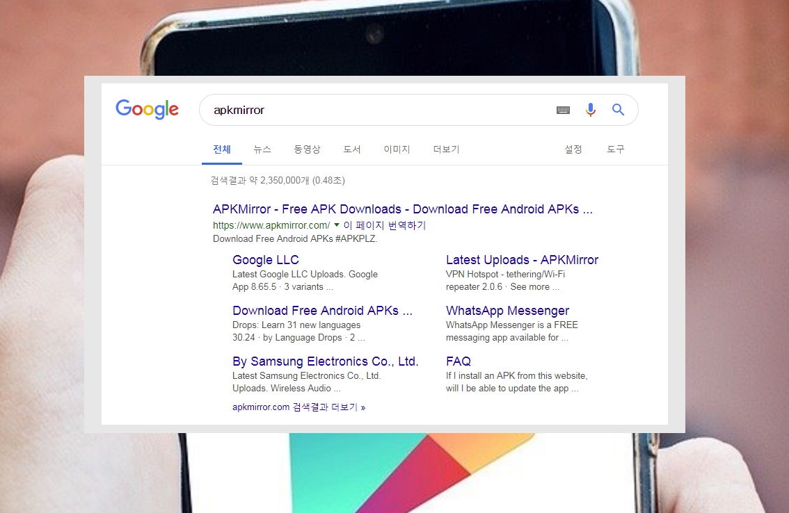 1. 스마트폰 어플을 다운로드 받거나 설치하려면 플레이스토어가 필요하죠? 그런데 지금 스토어 앱이제대로 작동하지 않으니 어떤 앱도 쉽게 찾아보거나 설치할 수 없는 상황입니다. 걱정하지 마세요. APK 파일을 이용하면 스마트폰 전용 어플을 수동으로 깔아보겠습니다. apkmirror 사이트에서 apk 파일을 내려 받을 수 있어요.