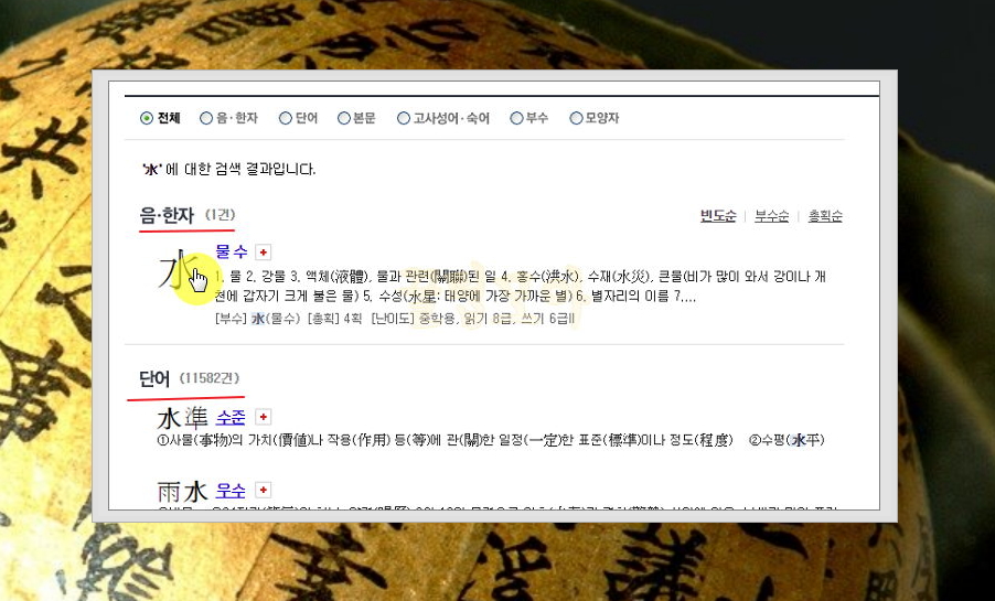 과거에 옥편 한문찾기를 하다보면 헤매는 경우가 있는데요. 그럼 1분 이상 걸리곤 했답니다. 지금은 인터넷으로 몇 초만에 결과를 볼 수 있고, 획수나 부수, 인명용 여부 등의 정보까지 얻을 수 있어요. 해당 문자가 들어간 단어와 고사성어를 통해 쓰임새도 알 수 있습니다.