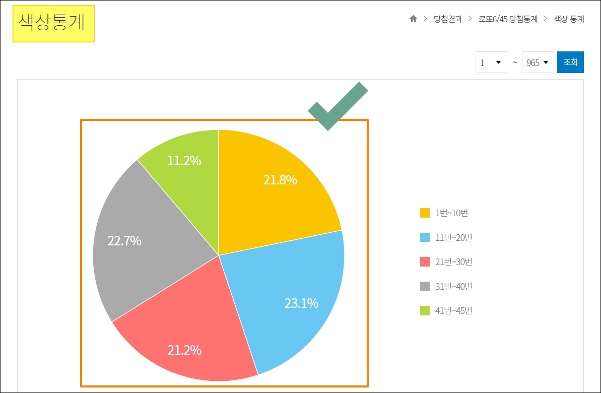 이번에는 색상으로 알아보는 통계입니다. 지금까지 나온 로또당첨번호를 가지고 어느 구간 대가 가장 많이 나왔는지 알아볼 때 유용합니다. 모든 구간 마다 비슷한 비율로 추첨이 된 것을 알 수 있습니다. 신기하네요.