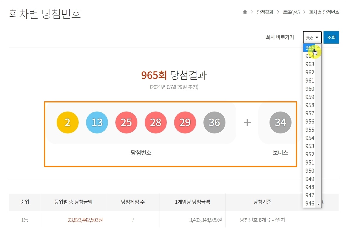 회차별 당첨번호 페이지가 열렸습니다. 여기에서 최근 결과 확인이 가능합니다. 그리고 등수에 따라 얼마의 상금을 받게 되는지 그리고 기준은 어떠한지 알 수 있는데요. 우측 상단에 있는 회차 바로가기에서 회차를 변경해 보세요. 그럼 여러 회차 선택이 가능합니다.