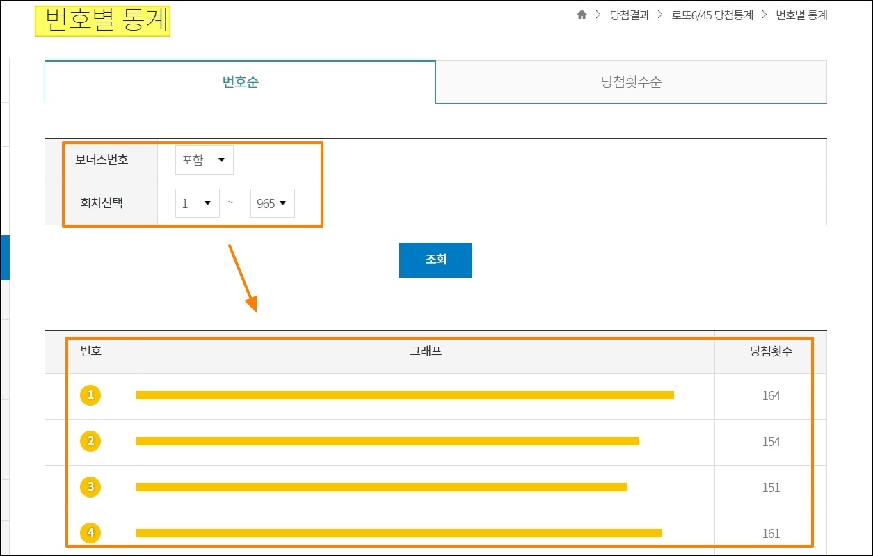 가장 먼저 번호별 통계 자료의 경우 여러 회차에서 가장 많이 나온 숫자를 찾을 때 유용합니다. 각 숫자에 따라 추첨된 횟수가 나타나는데요. 숫자 선택을 할 때 활용하기에 좋은 자료입니다.