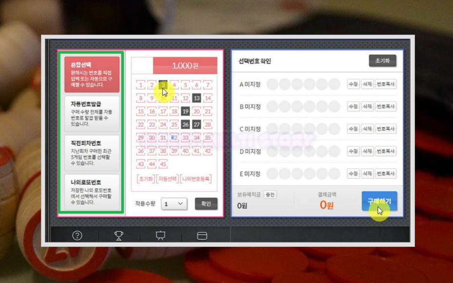 ▼ 인터넷 사이트에서 복권을 구매하는 것은 생각보다 어렵지 않습니다. 판매점에서 구매할 때와 마찬가지로 번호를 선택하기만 하면 됩니다. 로또 번호를 모두 선택했으면 [구매하기] 버튼을 누르면 됩니다. 미리 보유예치금을 충전해야 구매가 가능하다는 점을 알아주시길 바랍니다. 그리고 좌측에 있는 버튼을 통해 자동번호를 사용하는 것도 가능합니다.