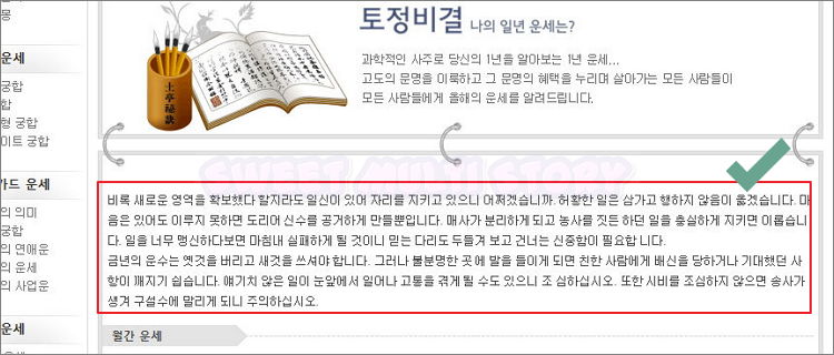 1. 지금 인터넷에서 토정비결을 볼 수 있는 사이트가 꽤 많습니다. 유명한 곳도 있고, 그렇지 않은 곳도 있는데요. 이번에는 사람들이 잘 모르는 사이트를 통해 무료 운세를 보는 방법을 알려드리려고 해요. 다른 곳과 다를 바 없이 2024년 운세는 물론이고, 2024년 이후인 먼 미래의 일까지 예측하는 데에 도움이 됩니다.