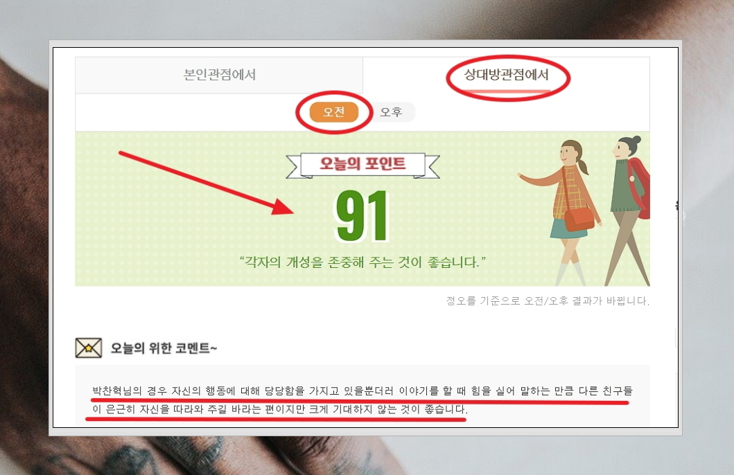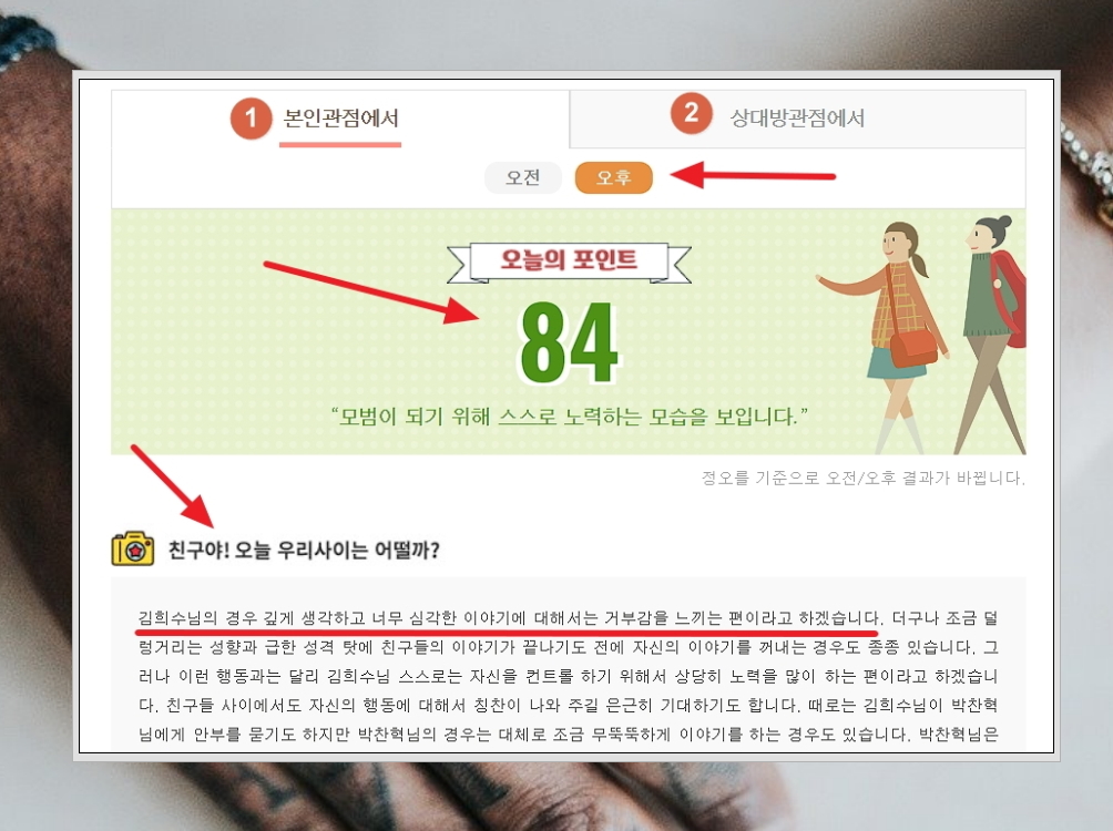 8.친구와의 오늘 하루 서비스는 특이하게도 오전과 오후 이렇게 2가지 결과를 보여줍니다. 또 한 가지 본인과 상대방 관점의 풀이를 모두 볼 수 있어요. 오늘의 포인트를 통해 오늘 하루 상대방과의 관계까 얼마나 좋은지 바로 확인도 가능합니다.