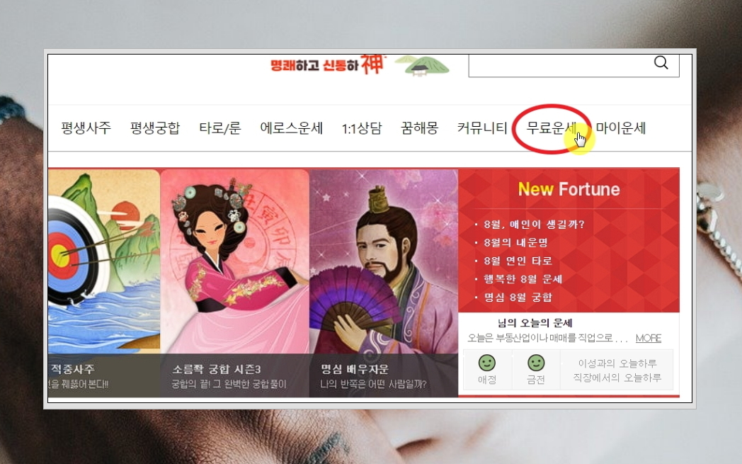 3. 해당 사이트에서는 사주, 꿈해몽 등 다양한 역술을 이용할 수 있게 되어 있는데요. 이 중에서 우리가 볼 것은 무료운세 서비스입니다. 여기에 무료로 궁합을 볼 수 있는 역술 서비스가 있어요.