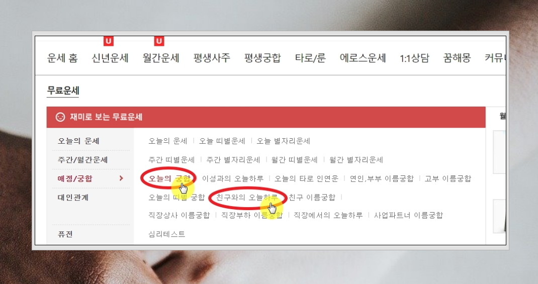 4. 네이트 운세 사이트에서 무료로 볼 수 있는 역술 서비스가 꽤 많습니다. 이 중에서 우리가 이용할 것은 "오늘의 궁합"과 "친구와의 오늘 하루" 입니다. 두 가지 모두 생년월일 정보를 기반으로 깊이 있는 풀이를 보여줍니다.