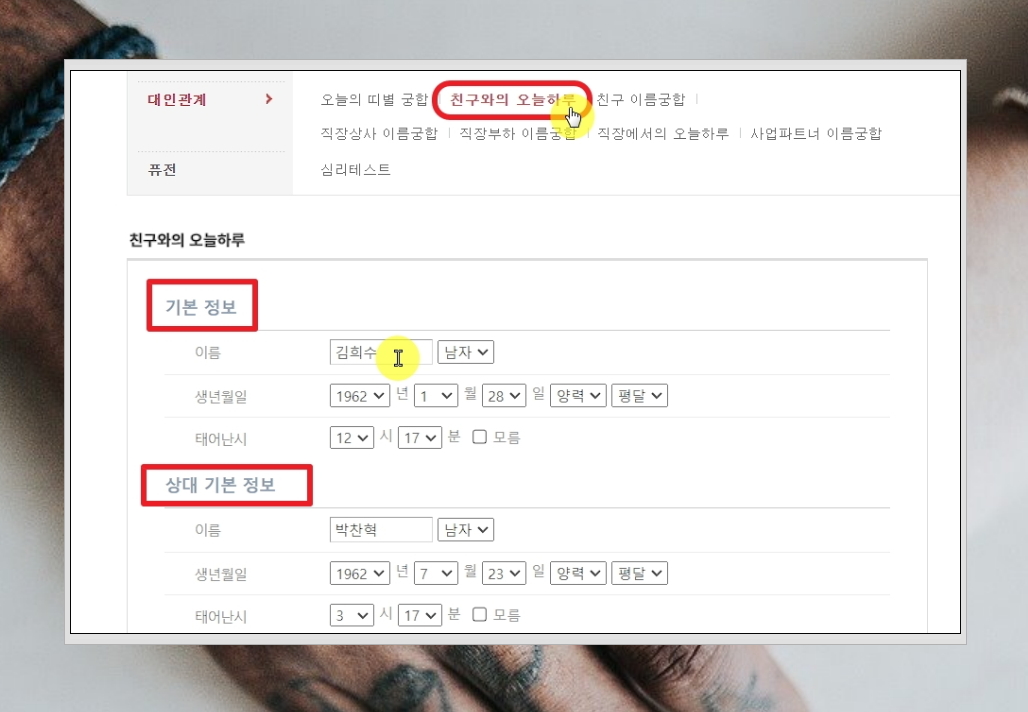 5. 먼저 오늘의 궁합 서비스를 이용해 보겠습니다. 본인과 상대방의 이름, 생년월일, 태어난시를 정확하게 입력해 주세요. 성별도 마음대로 선택이 가능합니다.
