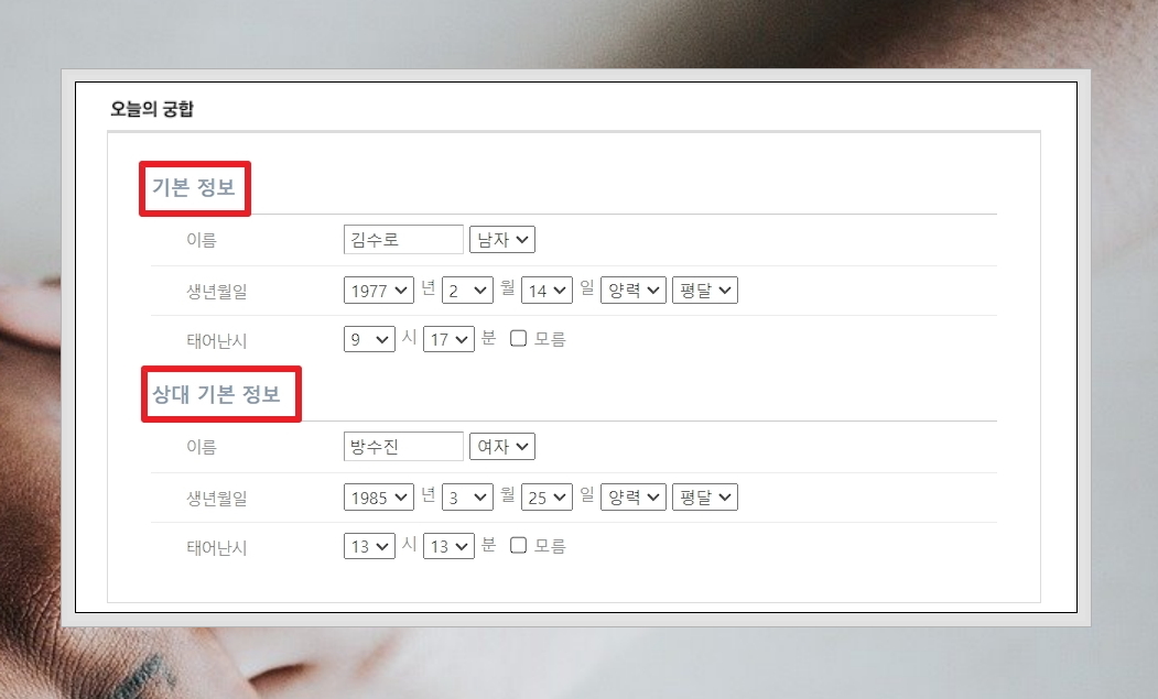 이름, 생년월일, 성별, 태어난 시각을 바탕으로 보는 궁합 서비스를 이용해 보았습니다. 연세가 있으신 분들은 자신의 생년월일을 음력 기준으로 알고 계시는 경우가 있습니다. 이럴 때에는 양력으로 변환한 생년월일을 입력해 주시길 바랍니다.